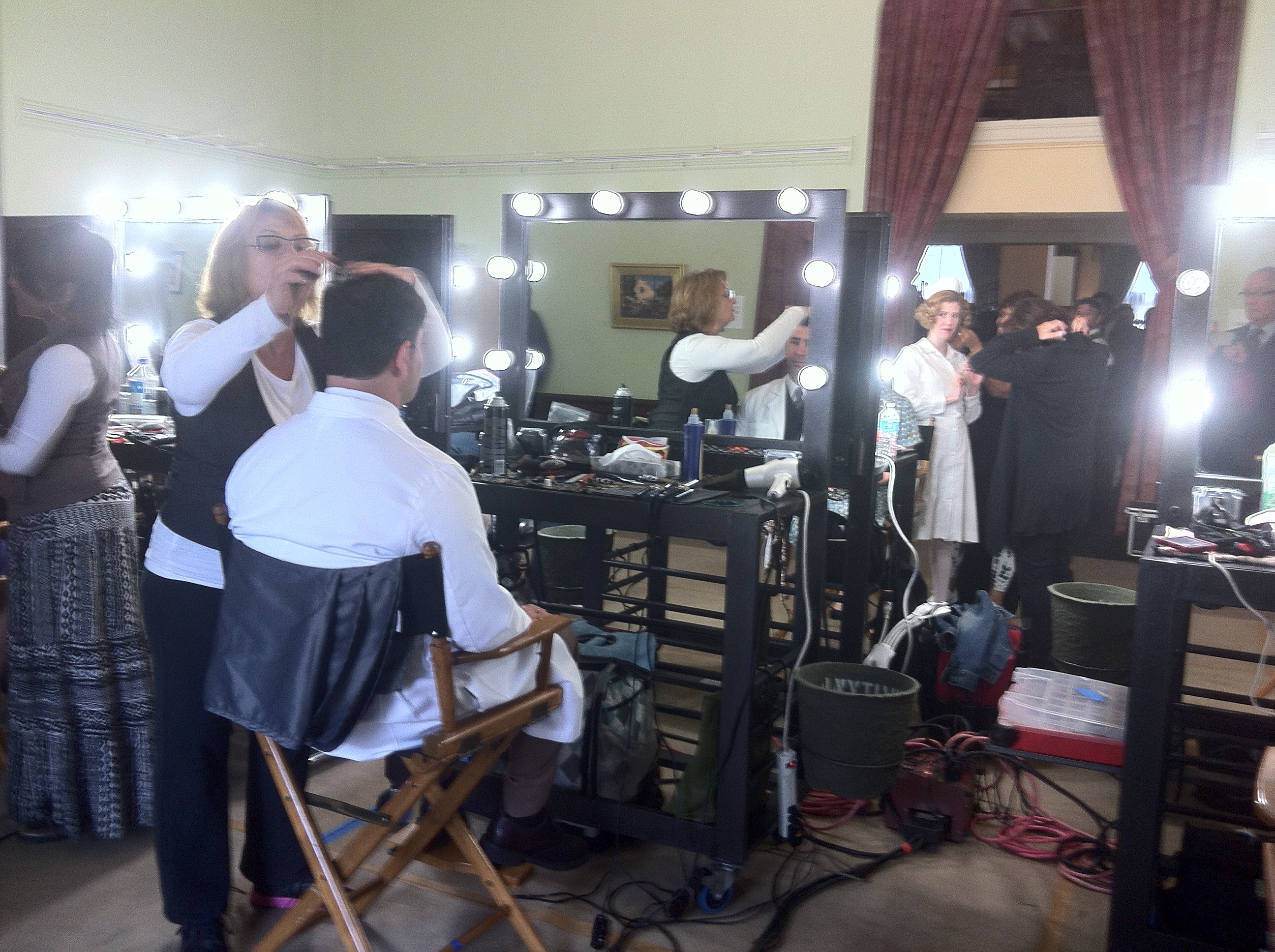 I first headed to wardrobe, and again got into pants almost up to my armpits and a suit coat long enough to cover my knee caps. Then on to hair and makeup, where I was greeted by one of my sensational stylists, Sharilandra . . . but she let’s me call her Cher for short.